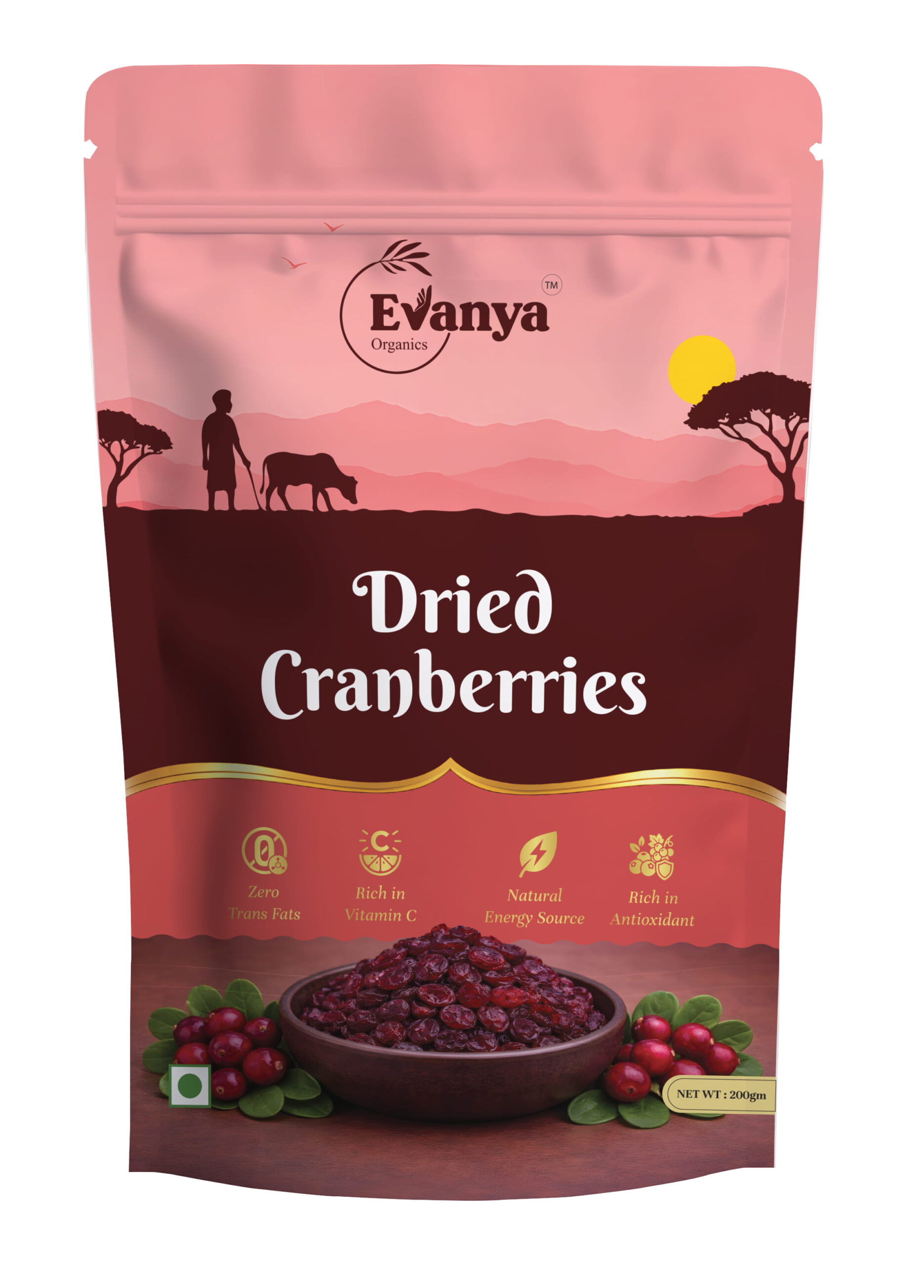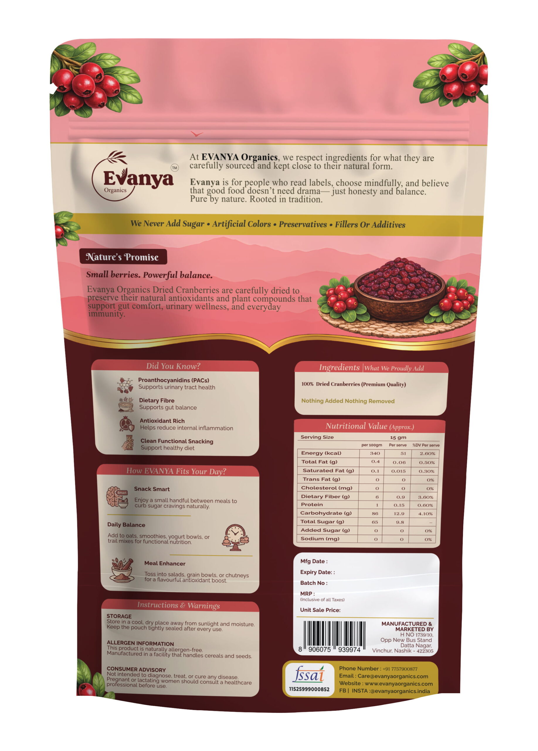 Evanya Organics Dried Cranberries — made from 100% premium quality dried cranberries. No added sugar, no artificial colors, no preservatives. Rich in antioxidants, Vitamin C, and natural energy. Small berries. Powerful balance.