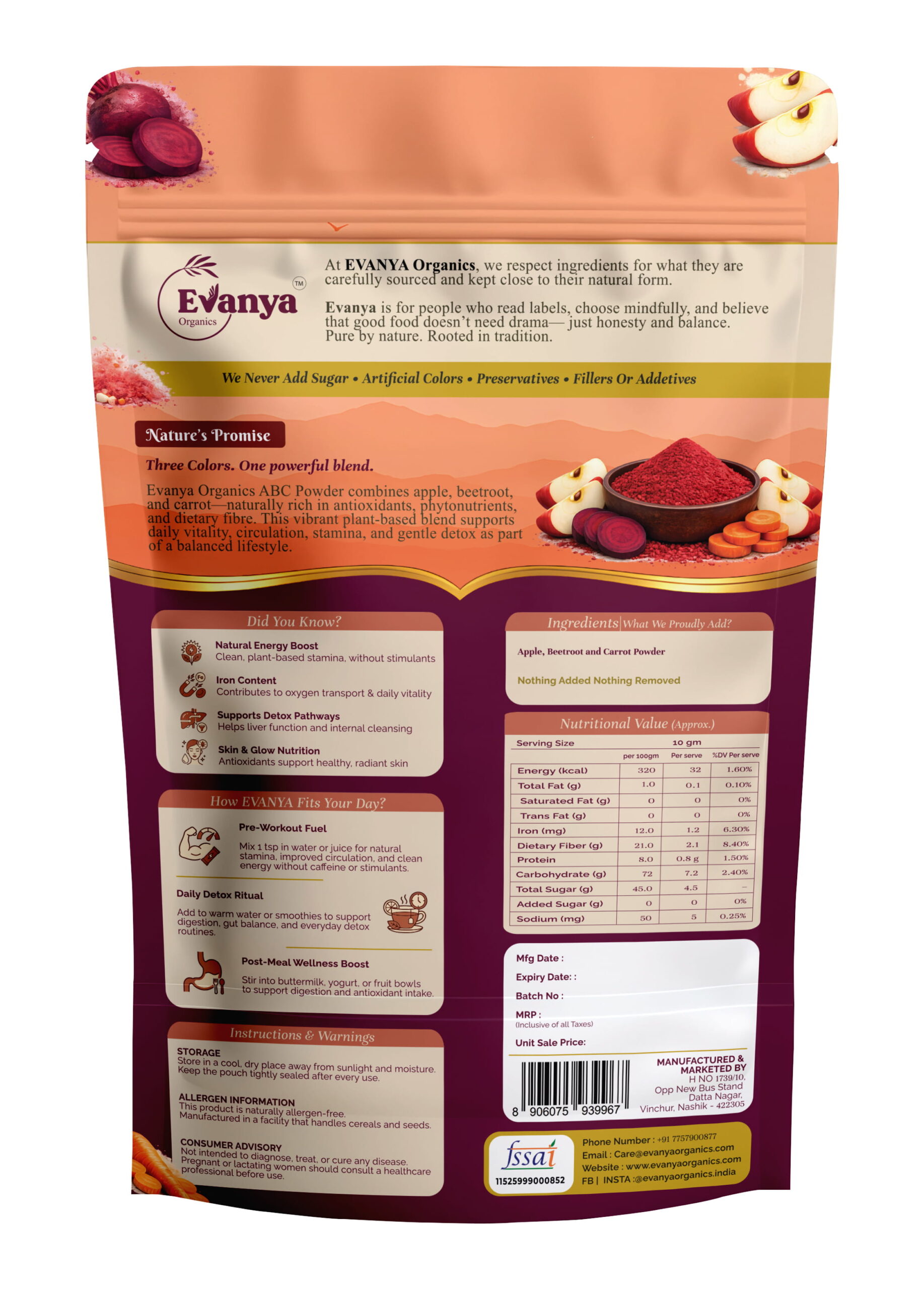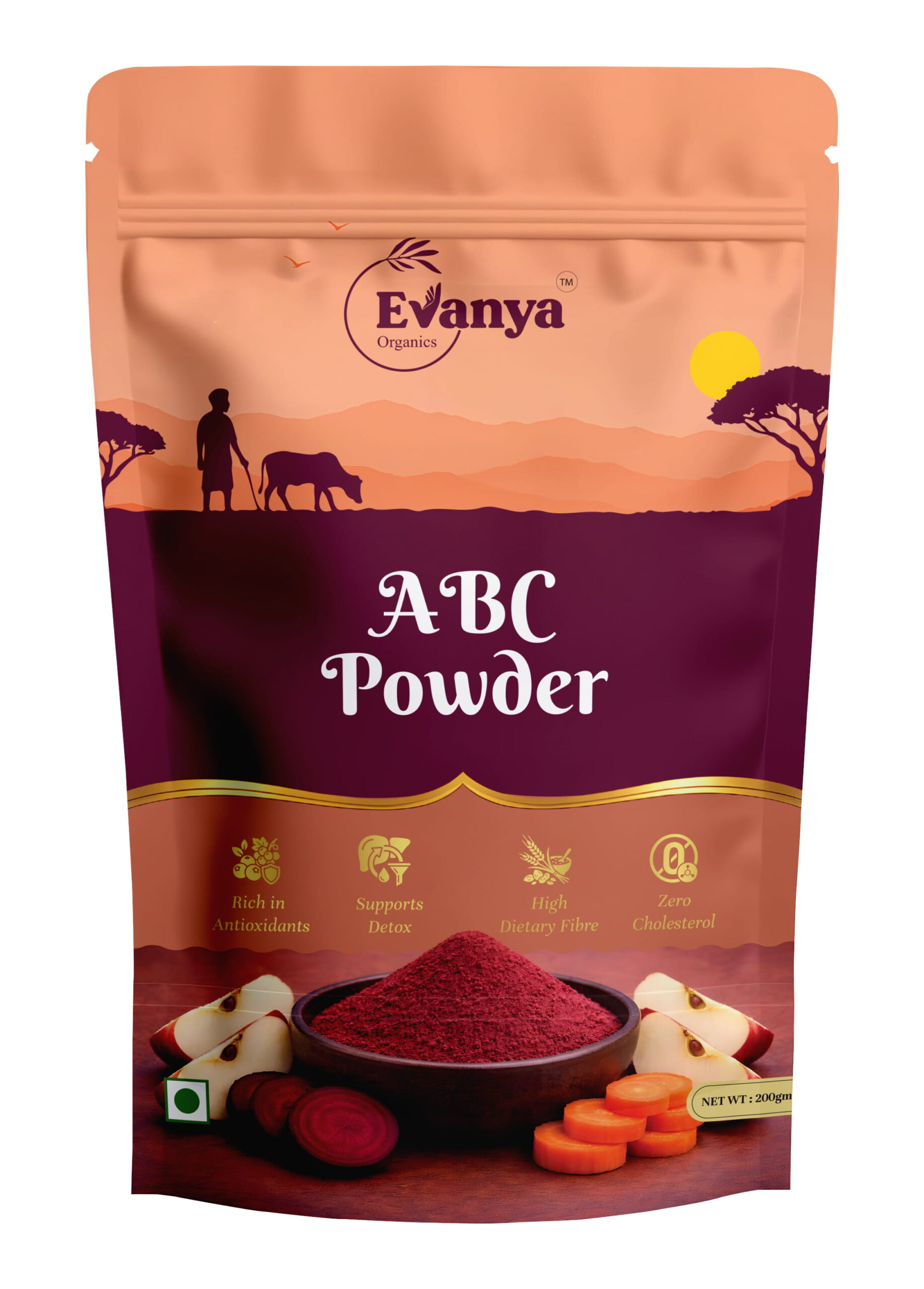Evanya Organics ABC Powder — a vibrant blend of Apple, Beetroot, and Carrot powder. No added sugar, no artificial colors, no preservatives, no fillers or additives. Rich in antioxidants, supports detox, high dietary fibre, and zero cholesterol. Three colors. One powerful blend.