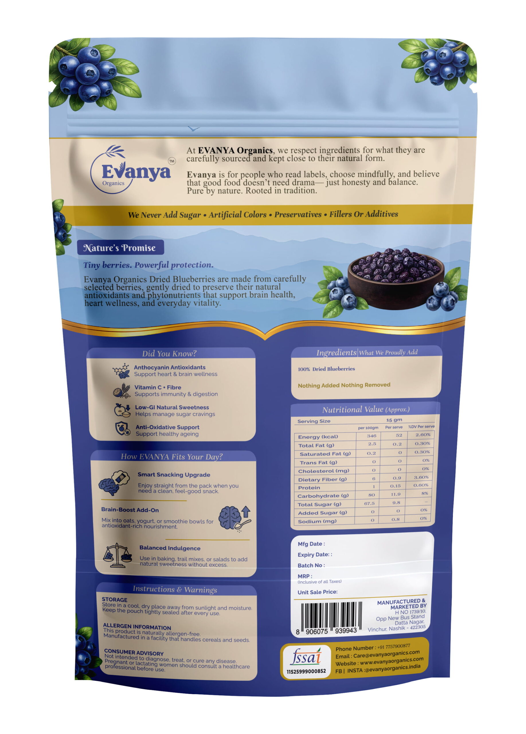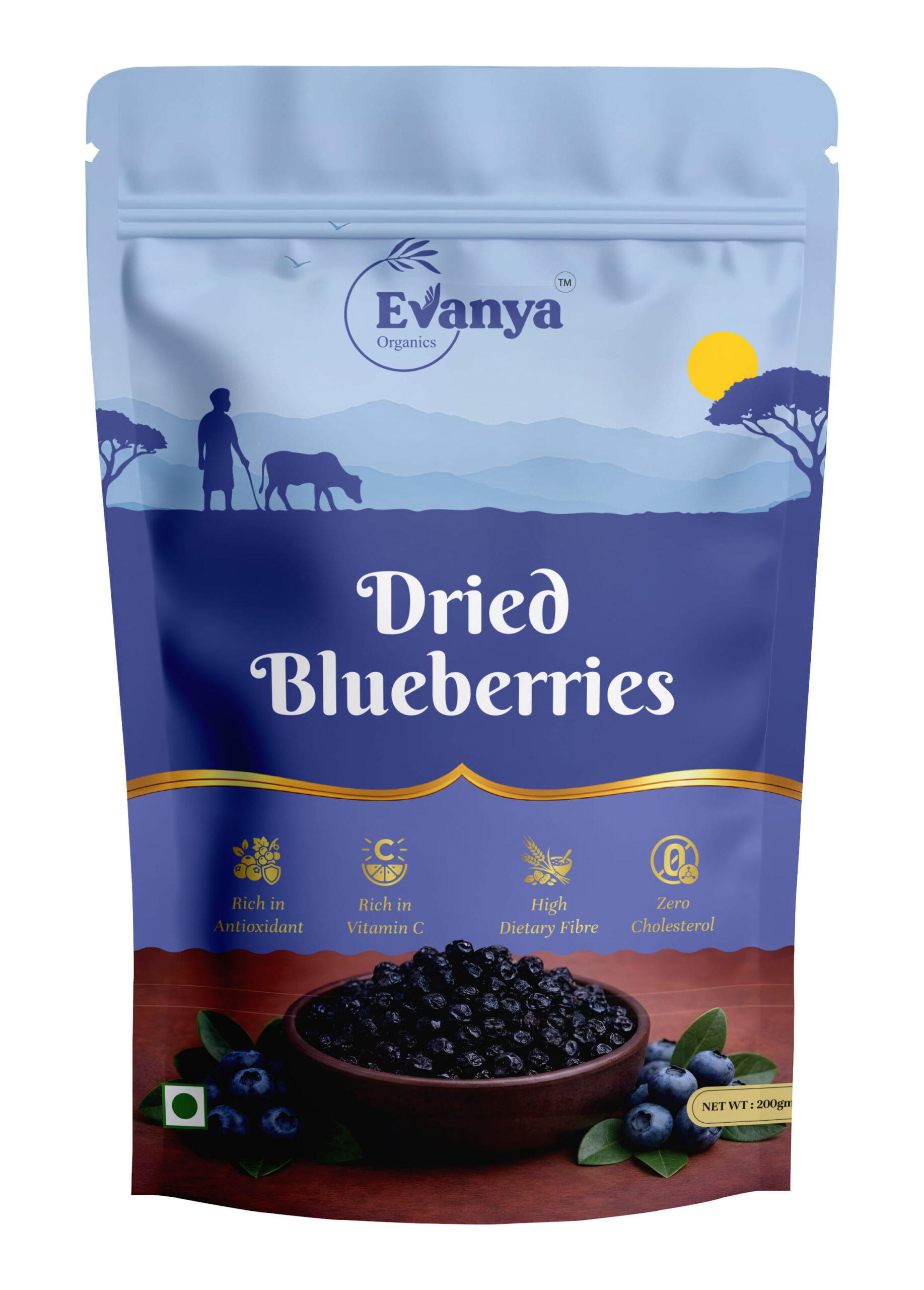 Evanya Organics Dried Blueberries — made from 100% carefully selected dried blueberries. No added sugar, no artificial colors, no preservatives. Naturally rich in antioxidants, Vitamin C, and dietary fibre. Tiny berries. Powerful protection.
