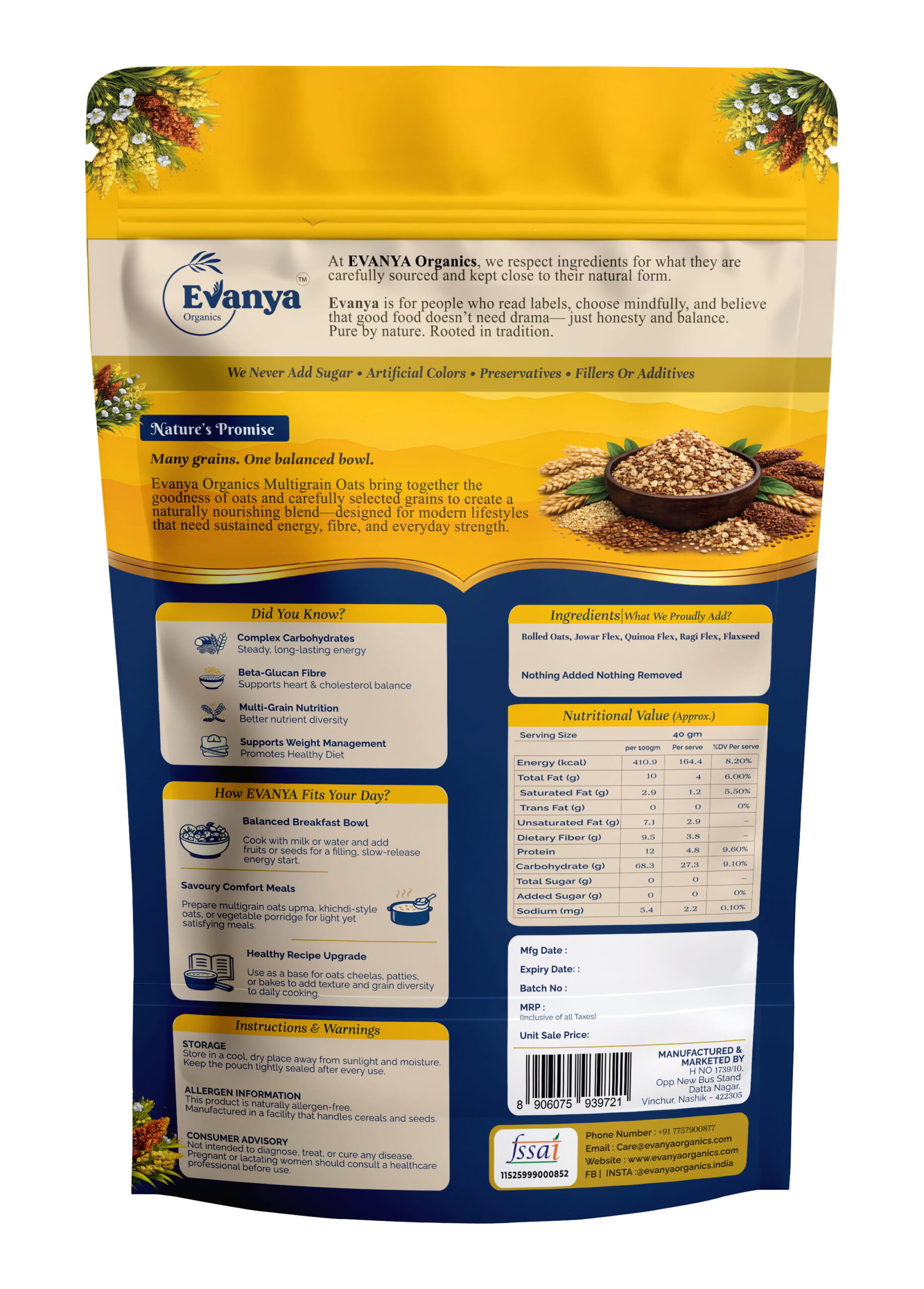 Evanya Organics Multigrain Oats — a powerful blend of rolled oats, jowar flex, quinoa flex, ragi flex, and flaxseed. No added sugar, no artificial colors, no preservatives. Naturally cholesterol-free, gluten-free, and high in dietary fibre. Many grains. One balanced bowl.